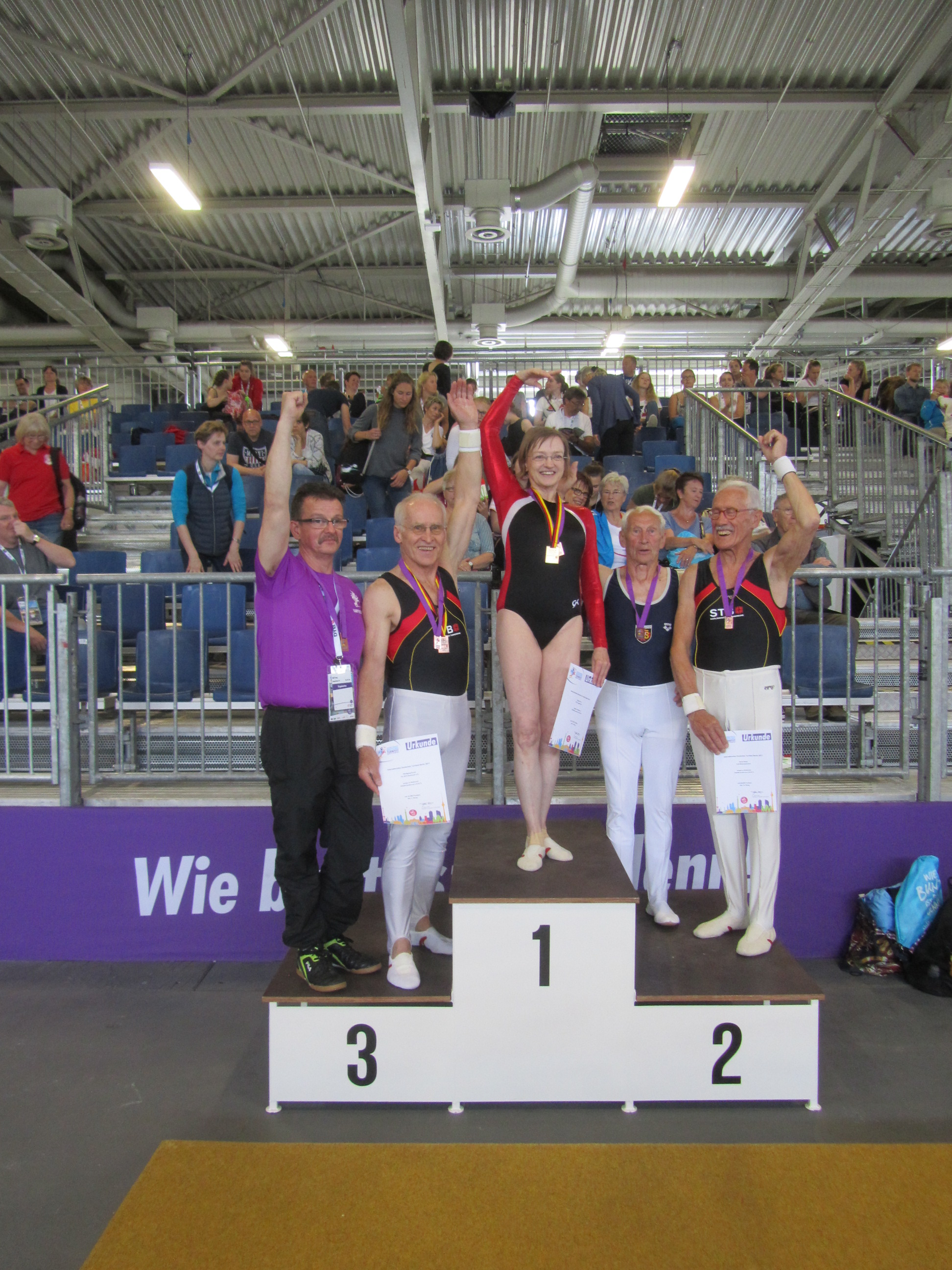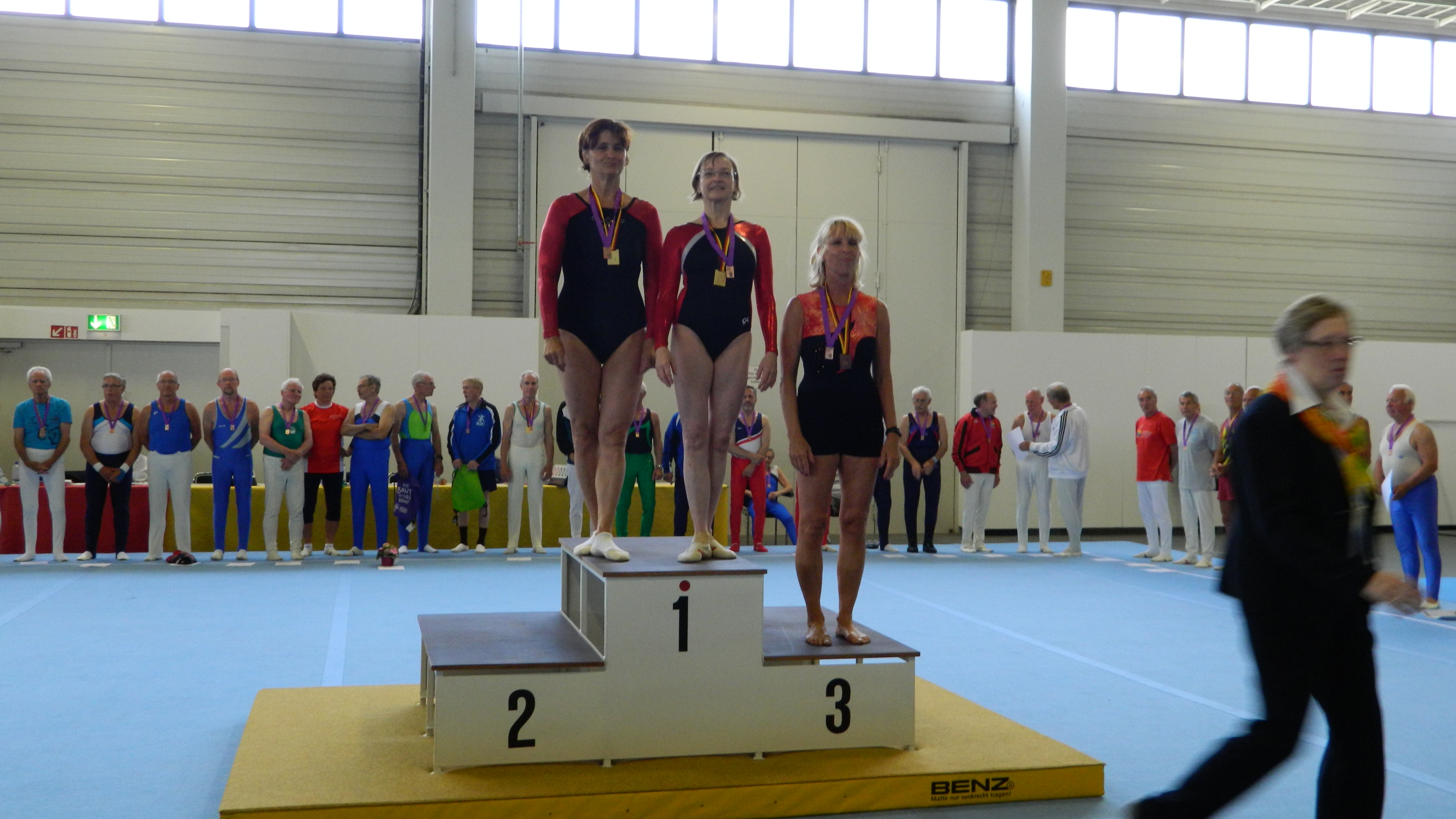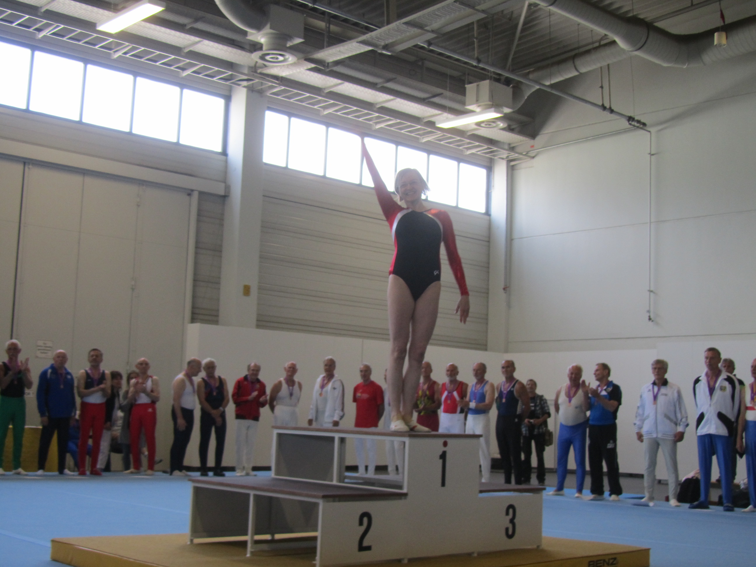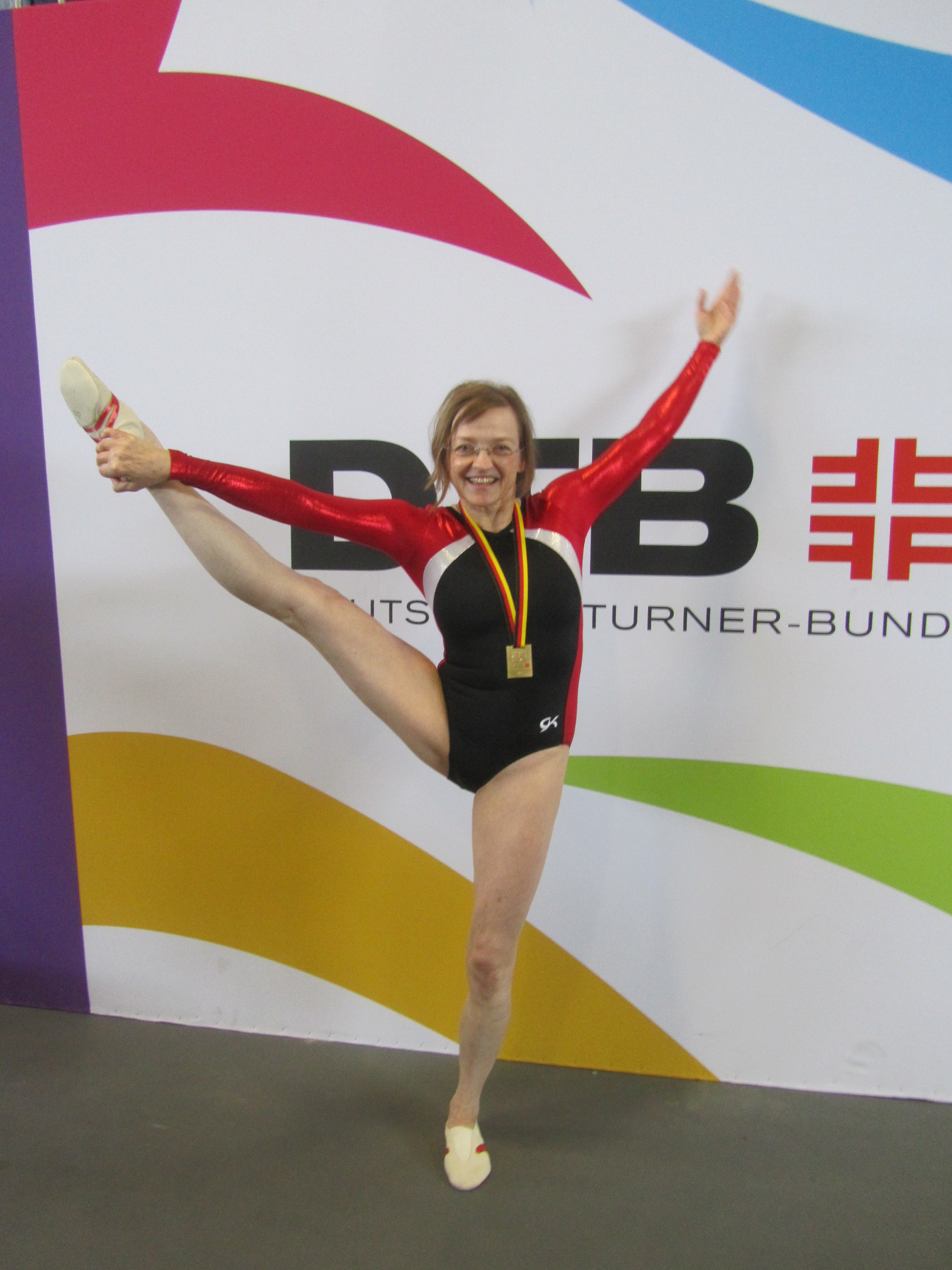 „Damit hätte ich absolut nicht gerechnet, daher freue ich mich umso mehr“, so berichtet Regine Carl über ihren sensationellen Erfolg bei den Deutschen Seniorenmeisterschaften. Der im Rahmen des Deutschen Turnfests 2017 veranstaltete Wettkampf in Berlin war mit 17 von 20 gemeldeten Turnerinnen aus ganz Deutschland hochkarätig besetzt. Am Ende konnte Regine mit 27,20 Punkten ganz oben auf dem Treppchen landen und darf sich fortan Deutsche Meisterin nennen. „Ein unbeschreibliches Gefühl! Auch nach ein paar Tagen kann ich es noch immer kaum glauben, was mir in Berlin gelungen ist. Ich bin sehr stolz auf meine Leistung“, sagt Regine.