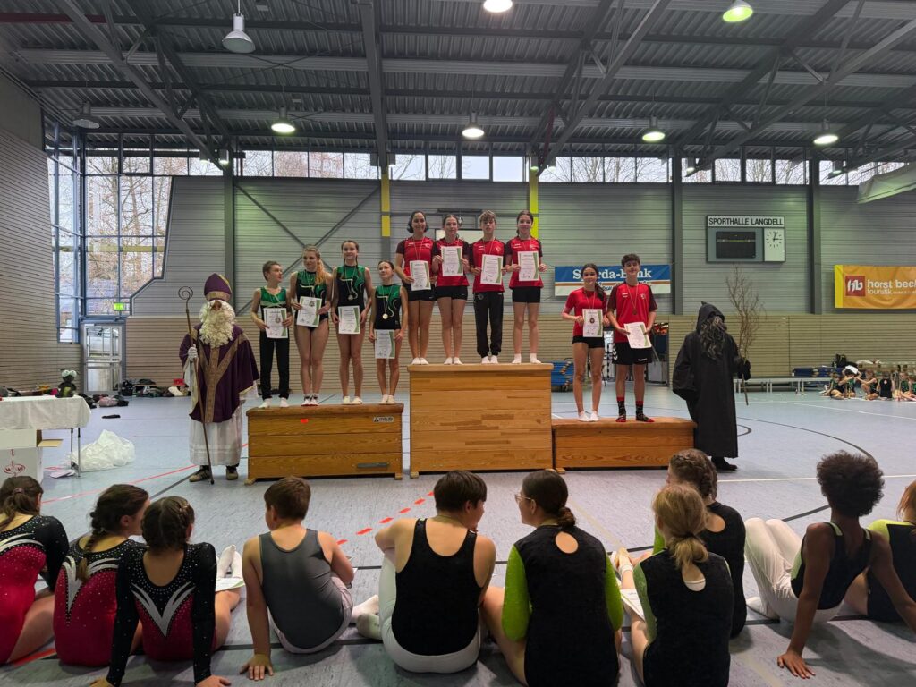 Pünktlich zum 6. Dezember lud der TuS Fireflies Spiesen zum Nikolaus-Pokal, bei dem knapp 60 Trampolinturner:innen aus dem ganzen Saarland in der Sporthalle Langdell zusammenkamen. Der TV St. Ingbert war mit einer starken Delegation von 20 Aktiven vertreten – von blutigen Anfänger:innen bis zu erfahrenen Profiturner:innen. Das besondere Format des breitensport-orientierten Wettkampfs lud dazu ein, mal etwas Neues zu riskieren, denn jede:r Teilnehmer:in hatte zwei Versuche, von denen lediglich der bessere in die Wertung einging.